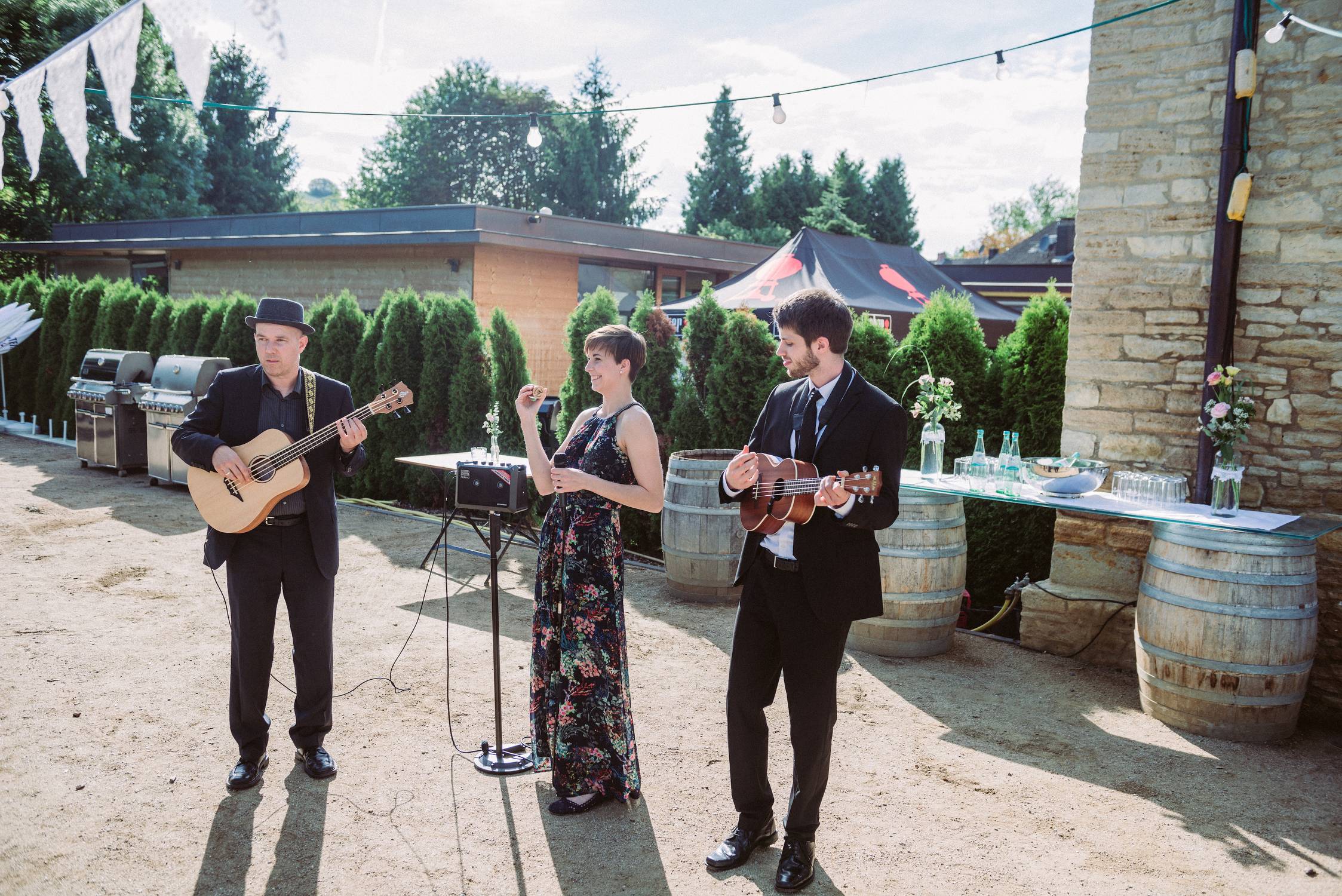 Flexibility: The trio lineup allows for high flexibility in controlling volume and space, yet sounds like a complete live band. Professional quality: Many years of experience in the event sector and completed music studies of all musicians guarantee a musical experience of the highest quality, as well as professional support from the first contact to the on-site performance. Your wishes and ideas are our focus. Individuality: By one or the other own arrangement and the trio setting known songs sound new and refreshing, but are still ideally suited for singing along. Walking Act: A great highlight is our short walking act. With acoustic vocals and ukuleles, bongos and shakers, we do not need electricity and are mobile.